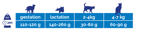 Les rations journalières indiquées sont indicatives et peuvent varier en fonction de facteurs tels que l’âge, la race, les conditions climatiques et surtout l’activité physique. Il est très important que l’animal ait toujours suffisamment d’eau propre. Conserver dans un endroit frais et sec.